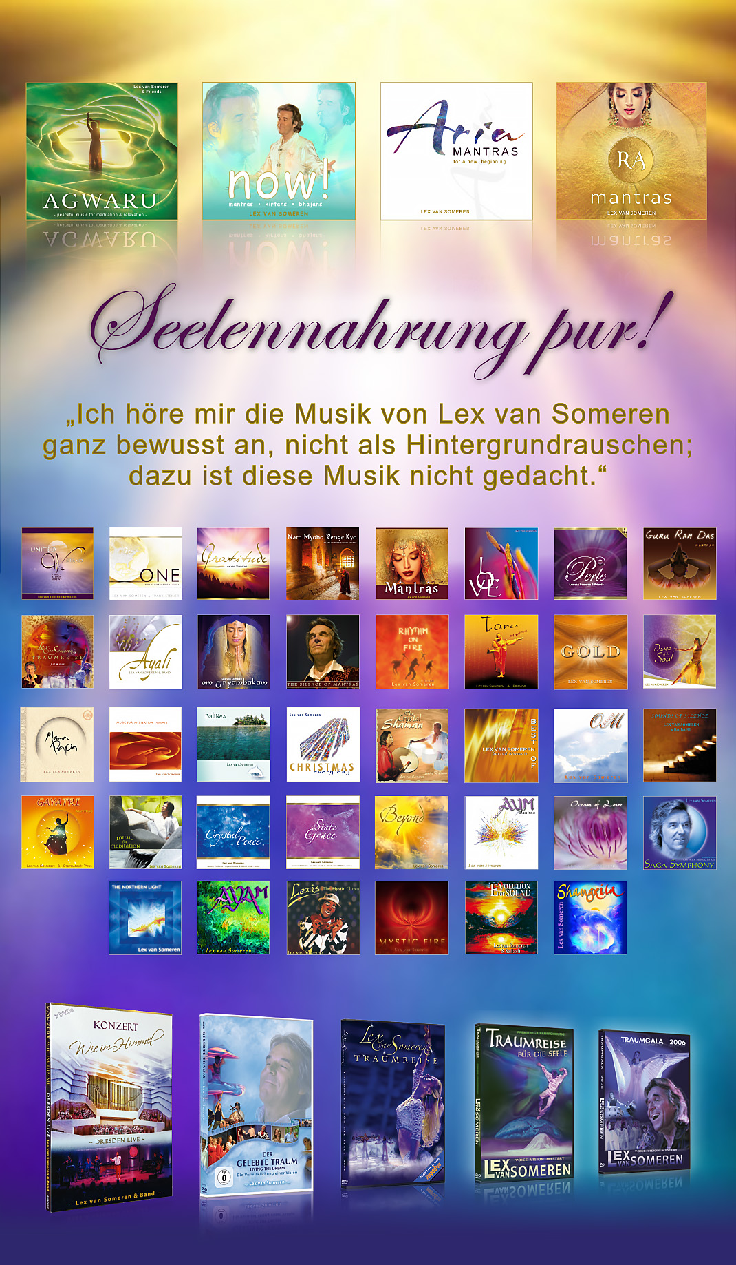 Dieses Album ist ein Gebet für die ganze Menschheit, um den inneren Frieden zu finden. Das Herz will frei sein, und das Gebet ist ein Tor. Mit „Gebet“ ist gemeint: die Lobpreisung an das wahrhaftige Leben, an die göttliche Kraft und an die Macht der Liebe in uns und in allem lebendigen natürlichen Sein. Diese teilweise orchestrale Musik und der Gesang (von Lex van Someren, Wivvica Matern, Maria Maltseva) - es sind auch ein paar Mantras dabei - sind eine Ode an die souveräne Kraft in uns, um das natürliche Leben und die Menschlichkeit zu behüten und zu schützen und danach tatkräftig zu handeln. |